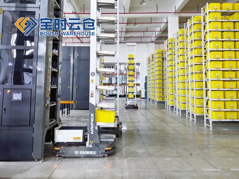 然而,在宝时智慧云仓上演的却是另一番景象:在偌大的仓库里,只有AGV机器人,根据WMS系统的调度,轻轻松松到指定货位拣取商品。